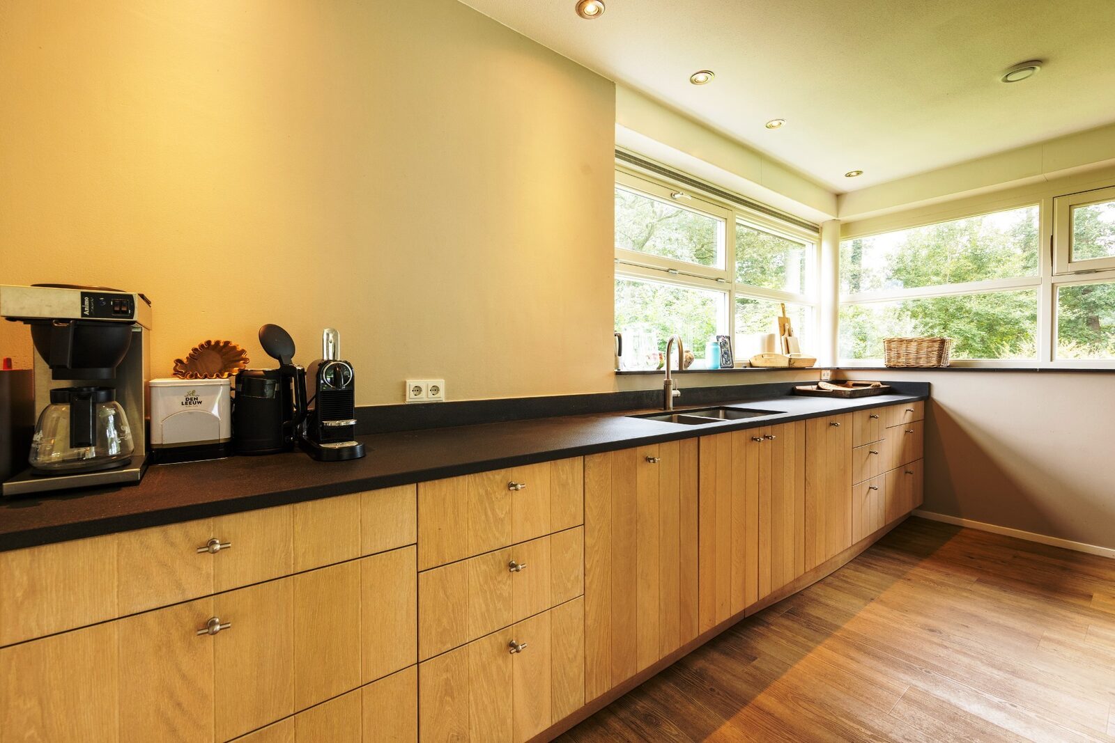 Open keuken met kookeiland met eetbar en 4 stoelen en lange eettafel met stoelen, inductie kookplaat, dubbele koelkast, stoomoven en combi-oven/magnetron, 2x vaatwasser, Quooker en Nespressomachine en koffiezetapparaat (grote ronde filters zelf meenemen).